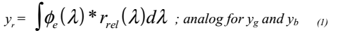 这是通过分析测量结果发现的一个问题,但可能还有其他未知的问题。 为了进一步分析数据,拍摄了已知着色剂(IT-8目标)的场景,并将实际的RGB值与计算出的RGB值进行比较。 通过使用光谱响应测量的结果来计算IT-8测试图的预期相机RBG数据。 它们由以下公式表示: